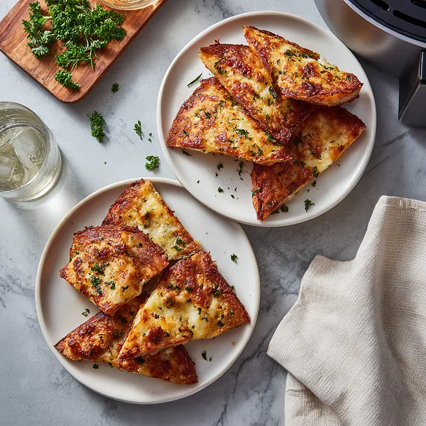 Thin tortillas crisp rapidly in the dry, circulating heat of the air fryer, mimicking the texture of toasted bread without lengthy baking. Butter promotes even browning while carrying garlic’s aromatic compounds across the surface. The combination of mozzarella for meltability and Parmesan for sharp flavor and browning creates balanced richness and structure. Because the base is thin and cooking time is short, the final dish remains moderately portioned at roughly 260–320 calories per serving depending on cheese and tortilla size.