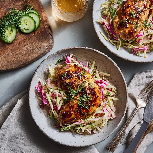 Apple cider chicken is a seasonal, flavor-forward dish that pairs juicy, pan-seared chicken with a glossy sweet-tangy glaze and a crisp, refreshing slaw. The apple cider reduction caramelizes beautifully on the chicken, while the fresh dill and pickled vegetables add brightness and contrast. The final result is balanced, comforting, and light enough for everyday dinners.