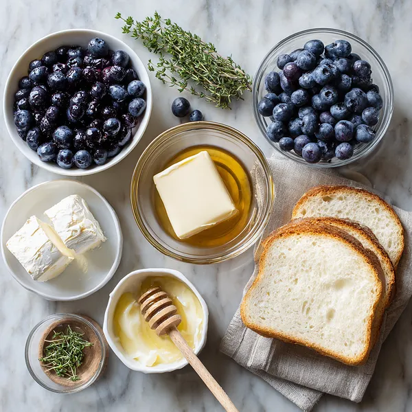 Slice the brie with the rind removed, rinse and dry blueberries, and strip thyme leaves from stems so everything is ready for assembly.