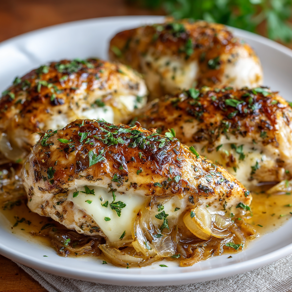 • The “Soup” Garnish: To truly lean into the French Onion theme, serve each breast with a toasted baguette crouton on top.