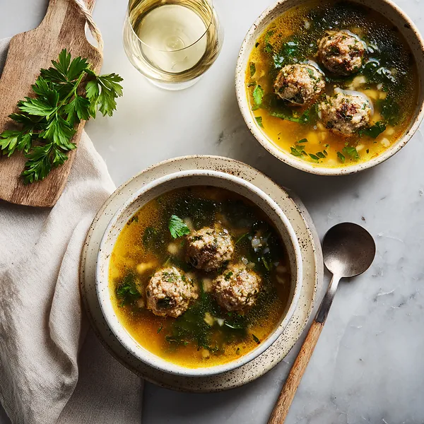 • Elegant presentation – Small meatballs, greens, and golden broth create a visually inviting dish.