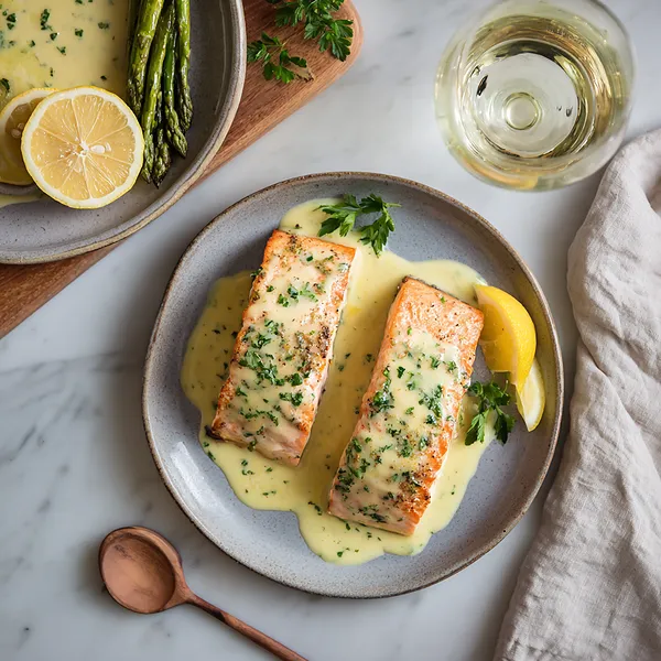 - Finish & Serve – Stir in half the parsley, season to taste, spoon sauce over salmon, and garnish with remaining parsley and lemon slices.