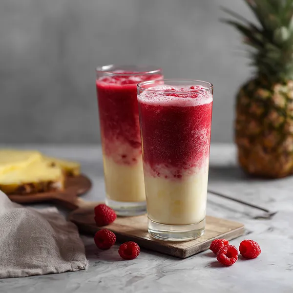 This drink succeeds through contrast in both flavor and density. Tart raspberry purée provides acidity and vivid color, while coconut cream contributes fat for smooth mouthfeel and natural emulsification. Pineapple adds enzymatic brightness and sweetness, balancing the richness. Layering works because the thicker coconut blend floats above the denser raspberry base, creating visual appeal alongside complementary taste. At roughly 220–320 calories per serving without alcohol, it remains a relatively light indulgence.