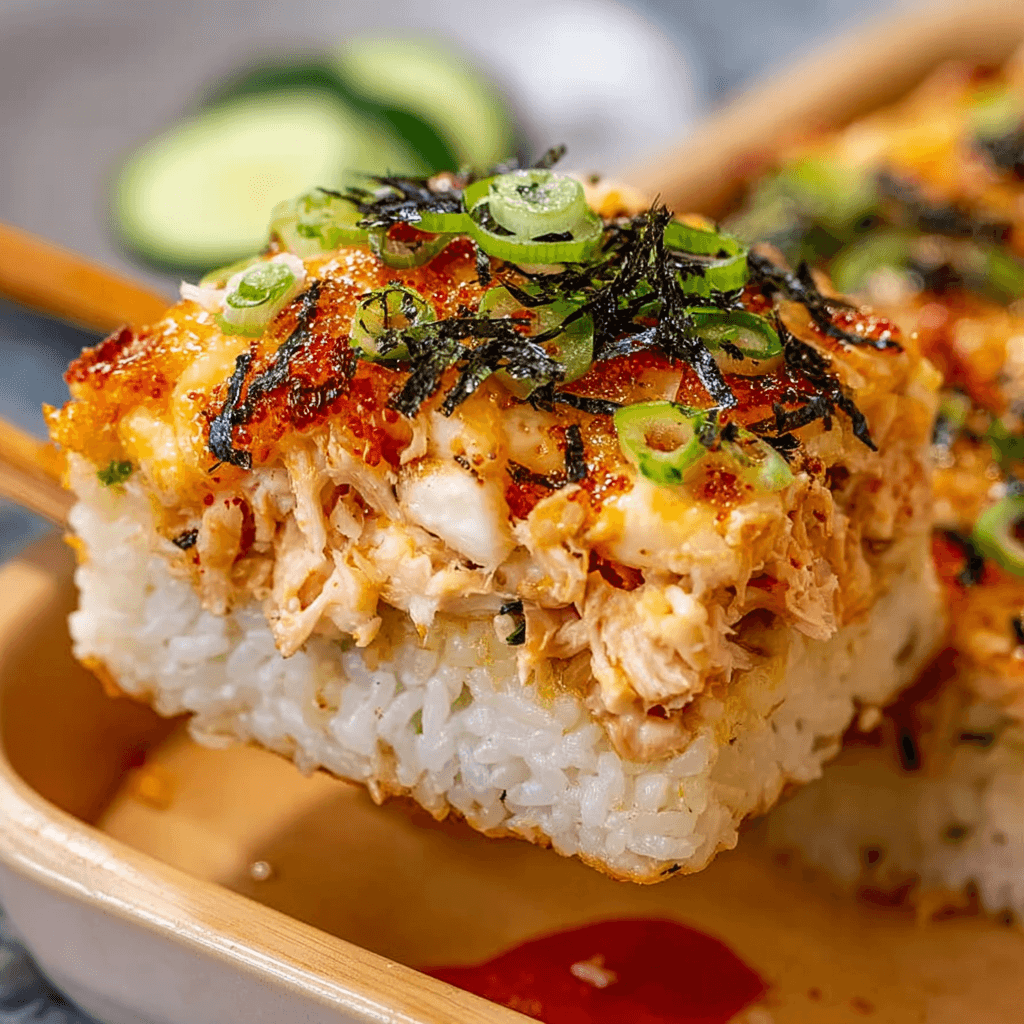 This sushi bake is built in layers: seasoned rice, a creamy seafood mixture, and toppings that add texture and contrast. The quantities below fit a standard 9×9-inch baking dish.