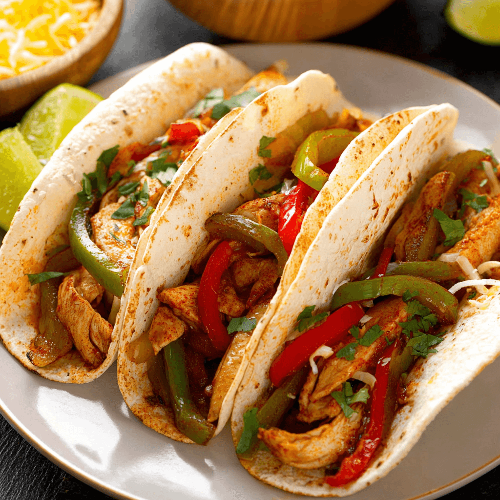 This dish is a celebration of textures. You have the soft, warm embrace of the tortilla, the tender and juicy chicken, and the crisp-tender snap of the peppers. The flavor profile is dominated by the “Big Three”: the earthiness of the cumin, the smokiness of the paprika, and the sharp, citrusy zip of the lime. Because we cook the vegetables over high heat, they take on a subtle sweetness as their natural sugars caramelize, providing a beautiful foil to the savory, spiced chicken.